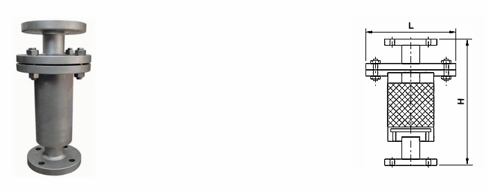 礫石阻火器是一種由外殼、阻火芯、緊固件等組成,用來阻止易燃?xì)怏w和液體蒸氣的火焰?zhèn)鞑ズ吐拥陌踩b置,外殼由兩端分別設(shè)有大小法蘭盤的上下兩個圓柱形結(jié)構(gòu)殼體組成,兩殼體之間通過大法蘭盤相連,并將阻火層設(shè)置在其空腔內(nèi),其中所述阻火芯是由能夠通過氣體的并具有若干通道或縫隙的砂粒、卵石、玻璃球、陶瓷球或金屬顆粒等堆積而成。當(dāng)出現(xiàn)回火時,火焰經(jīng)礫石之間狹小間隙和孔隙后,被分成許多細(xì)小的火焰流,由于熱量降低和被大量吸收,火焰猝滅。