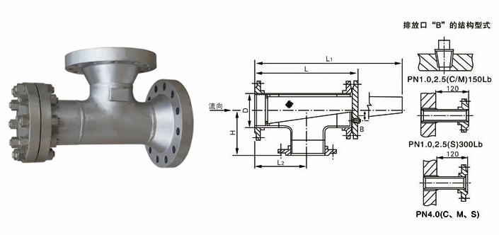 不銹鋼正折流式T型過濾器外形結(jié)構(gòu)圖: