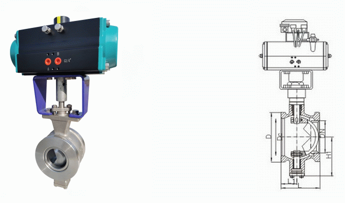 不銹鋼氣動(dòng)V型對(duì)夾球閥外形結(jié)構(gòu)圖: