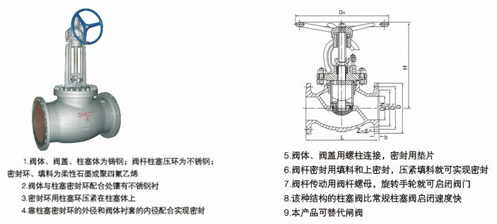 大口徑柱塞閥(活塞閥)是由閥體、閥蓋、閥桿、柱塞、導向、密封環(huán)、手輪等零件組成(如圖)。當手輪旋轉時,通過閥桿帶動柱塞在導向套中上、下往復運動,使柱塞端部斜錐面與閥座錐面完成閥門的開啟與關閉功能。 在閥門中柱塞與密封環(huán)間采用過盈配合,通過調(diào)節(jié)中法蘭螺栓預緊力,使密封環(huán)壓縮所產(chǎn)生的側向力與閥體中孔面柱塞外圓密封,從而保證了閥門的密封性。杜絕了內(nèi)泄漏。 由于密封環(huán)采用回彈性強、耐磨性高的無毒新型密封材料,所以密封可靠、經(jīng)久耐用,從而提高了閥門的使用壽命。 本閥門結合柱塞閥的無泄漏優(yōu)點和截止閥啟閉快的特點,成為一種結構新穎、用途廣泛的新產(chǎn)品。其優(yōu)越性遠勝于普通截止閥。