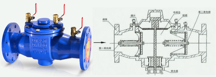 3、閥后管網(wǎng)水壓升高超過(guò)閥前進(jìn)水端水壓時(shí),如第二單向止回閥密封完好,水體不會(huì)倒流,此時(shí)泄水閥關(guān)閉不泄水,當(dāng)?shù)诙蜗蛑够亻y密封失靈產(chǎn)生滲漏時(shí),泄水閥開(kāi)啟排水泄壓。