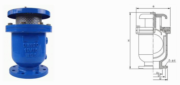 復(fù)合式快速進(jìn)排氣閥是一種由閥體、浮體、升降罩、大孔和小孔密封組件、閥蓋、排氣罩以及浮體罩和防護網(wǎng)等主要部件組成的法蘭連接的整體式帶防護網(wǎng)進(jìn)排氣閥。它設(shè)有大、小進(jìn)排氣孔,并具有管道充水時能快速排氣,管線內(nèi)產(chǎn)生負(fù)壓時又能快速進(jìn)氣,在正常工作狀態(tài)下能排出管中聚集的少量氣體,排氣后又能自動閉閥。
