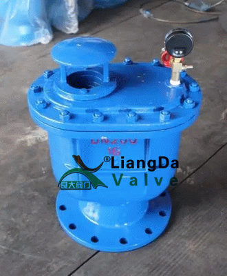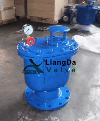 復合式排氣閥,閥體為圓桶狀,閥門內件包括不銹鋼浮球,杠桿及閥瓣,本閥安裝在泵出口處或送配水管線中,用來排除集壓在管中的空氣,以提高管線及水泵的使用效率。當管內一旦出現(xiàn)負壓時,此閥能迅速吸入外界空氣,以保管線因負壓所產生損壞。