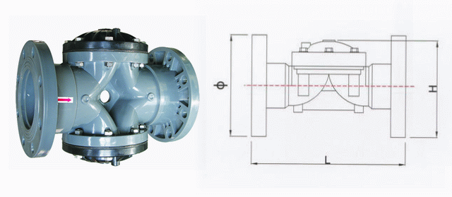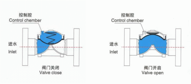 V型隔膜閥的關閉與開啟是通過來自管路的壓力作用于增強橡膠隔膜實現的。來水壓力直接通過密封隔膜開關閥門,隔膜上腔有壓時,隔膜切斷進水關閉閥門??刂魄恍箟簳r,利用來水壓力自動頂開隔膜打開閥門。閥門唯一活動部件為增強橡膠隔膜,在水通路上沒有閥軸、密封等,閥體采用PVC材料,可配合各種電磁閥、手動閥、減壓閥等實現各處控制功能。