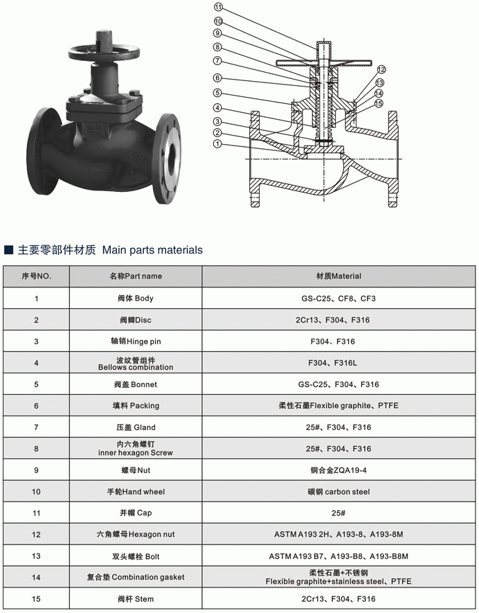 暗桿式德標(biāo)波紋管截止閥零部件材質(zhì):