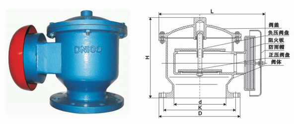 采用彈簧限位閥板,由正負(fù)壓力決定或呼或吸。呼吸閥應(yīng)該具有泄放正壓和負(fù)壓兩方面功能,具體則是:當(dāng)容器承受正壓時,呼吸閥打開呼出氣體泄放正壓;當(dāng)容器承受負(fù)壓時,阻火呼吸閥打開吸入氣體泄放負(fù)壓。由此保證壓力在一定范圍內(nèi),保證容器安全。