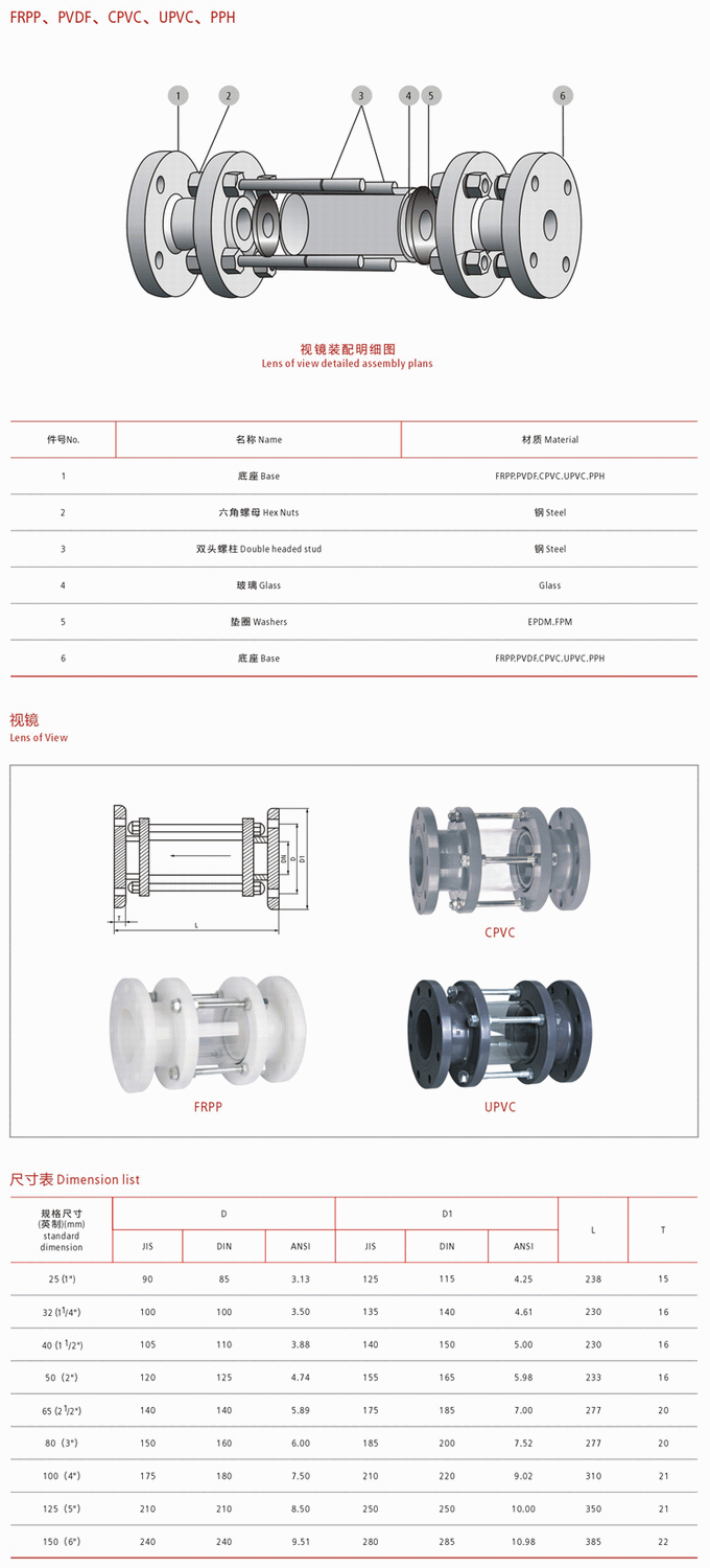 RPP,PPH,PVC塑料視鏡也叫做玻璃管視鏡或稱視盅,是安裝在管道或設(shè)備上可以隨時(shí)查看監(jiān)測內(nèi)部物料的工作情況。同時(shí)視鏡采用鋼化硼硅玻璃,聚乙烯四氟墊片,適用于大部分惡劣的工作環(huán)境中,并且使用壽命較長。是工業(yè)管道裝置上主要附件之一,在石油、化工、醫(yī)藥、食品等工業(yè)生產(chǎn)裝置的管道中,視盅能隨時(shí)觀察管道中液體、氣體、蒸汽等介質(zhì)流動(dòng)及反應(yīng)情況,起到監(jiān)視生產(chǎn)、避免生產(chǎn)過程中事故發(fā)生的作用。視盅由于結(jié)構(gòu)緊湊,它安裝簡單,使用方便,非常容易清洗與維修,是目前最常用的一種產(chǎn)品。
