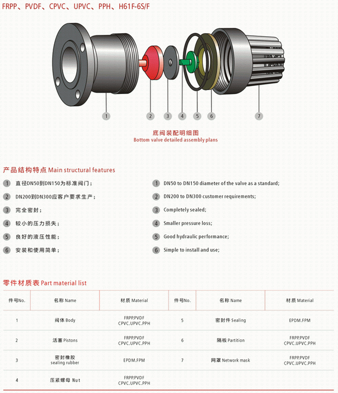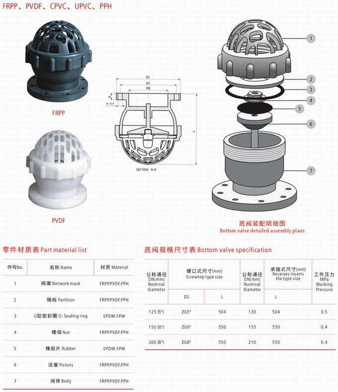 塑料底閥是一種節(jié)約能源的閥,一般安裝在水泵水下吸管的底端,限制水泵管內(nèi)液體返回水源,起著只進(jìn)不出的功能。閥蓋上有很多個(gè)進(jìn)水口和加強(qiáng)筋,起到了不易堵塞,主要應(yīng)用在抽水的管路上。水道和支承的作用.口徑有單瓣、雙瓣、多瓣型,有法蘭連接和螺紋連接。塑料底閥由閥體、閥蓋、閥瓣、密封圈和墊片等部件組成。底閥在接入管路后,液體介質(zhì)從閥蓋方向進(jìn)入閥體,液體的壓力作用于閥瓣,使得閥瓣被打開允許介質(zhì)流過,當(dāng)閥體內(nèi)的介質(zhì)壓力變化或消失時(shí),閥瓣關(guān)閉阻止介質(zhì)倒流。塑料底閥零件材質(zhì)表: