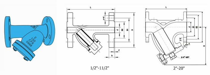 美標法蘭Y型過濾器外形結(jié)構(gòu)圖: