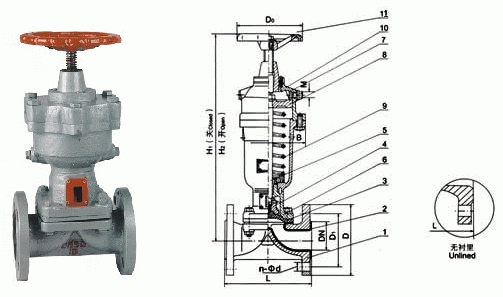8、隔膜閥的閥體內(nèi)腔表面復(fù)有可供選擇的多種橡膠、氟塑料等。因此具有耐腐蝕的特點。