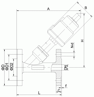 全不銹鋼法蘭氣動(dòng)角座閥外形結(jié)構(gòu)圖: