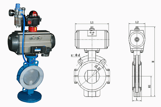 氣動對夾式襯氟蝶閥外形結(jié)構(gòu)圖: