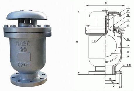 組合式快速進(jìn)排氣閥是一種由閥體、浮球、升降罩、排氣孔密封組件、閥蓋及排氣罩等組成,具有一大一小兩個(gè)排氣孔的進(jìn)排氣閥,其當(dāng)管道空管沖水時(shí),在工作壓力下可自動(dòng)快速排出管道中集結(jié)的空氣:當(dāng)管道內(nèi)產(chǎn)生負(fù)壓時(shí)可自動(dòng)進(jìn)氣,排氣后能夠自動(dòng)封水。本產(chǎn)品有整體式和分體式兩種,整體式在管內(nèi)正常輸水,浮球上端與閥體間形成壓力氣囊時(shí),浮球能及時(shí)靈活下降,在工作壓力下,打開閥門的小孔將壓力氣囊內(nèi)的氣體排凈。