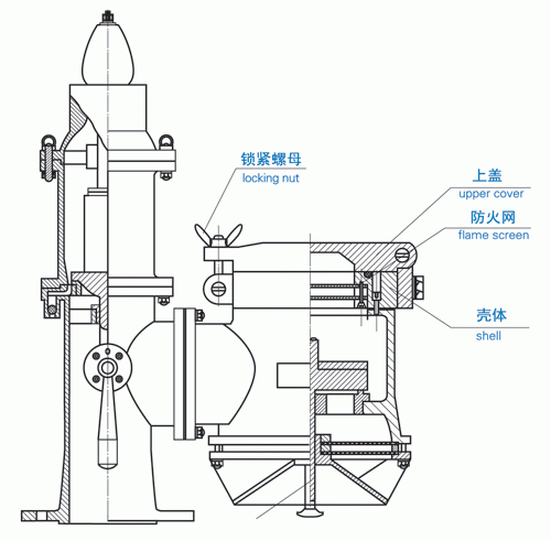 船舶設(shè)計(jì)院所及船東如還要在透氣系統(tǒng)的高速透氣閥上安裝其他附件,而又不能放棄驅(qū)氣蓋時(shí),驅(qū)氣蓋作為一個(gè)獨(dú)立的透氣工具,又可以安裝在高速閥的分支管上或透氣管的分支上。如圖所示。