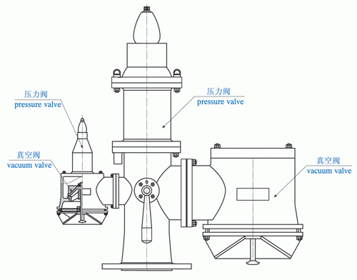 依據(jù)IMO和IBC規(guī)范,每只貨油艙需設(shè)兩套透氣裝置或一套透氣裝置加一套液貨壓力傳感器,以防止其中之一出現(xiàn)故障時也能確保艙內(nèi)不超壓或失壓。因此,經(jīng)認(rèn)可的各規(guī)格高速透氣閥,也可以將其中一個規(guī)格作為附件與主流量閥組合在一起。壓力設(shè)定成主流閥為正常工作壓力,附件閥為保險壓力。這樣的透氣方式既可最大限度地防止貨油艙超壓或失壓。同時,在裝載速率允許的情況下,也可以作為增大裝載速率的補助裝置,但這種透氣裝置成本較高。