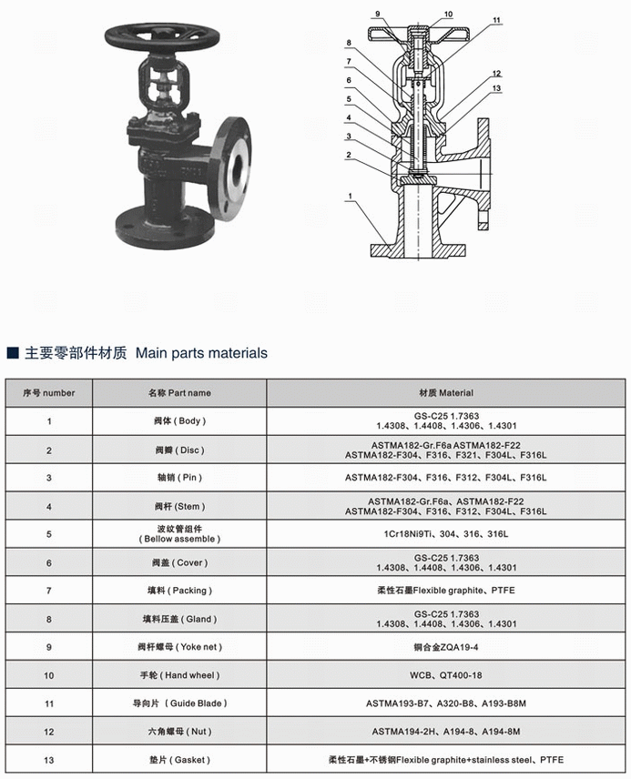 直角式波紋管截止閥零部件材質(zhì):