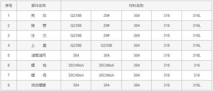 U型過濾器零件材料: