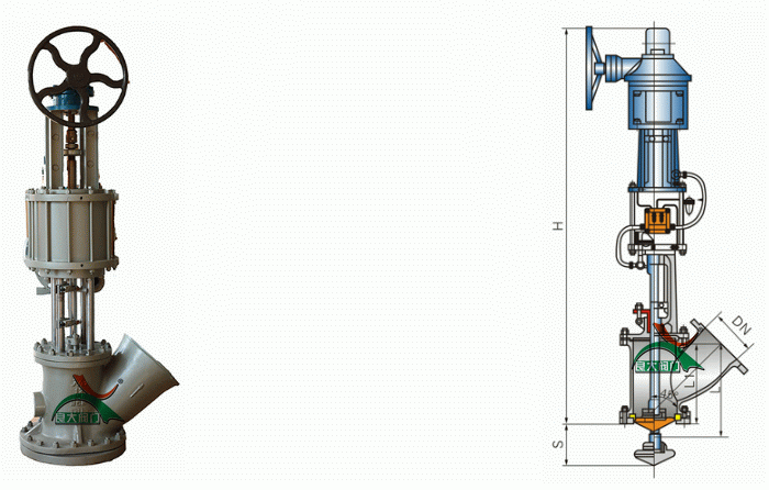 氣動平底放料閥有Y型及角式兩種結(jié)構(gòu)形式,根據(jù)實(shí)際工況的需要,放料口的形式設(shè)計(jì)有帶管接及平底兩種,閥體內(nèi)腔裝有耐沖刷、耐腐蝕的護(hù)板,在開啟閥門瞬間,可以保護(hù)閥體不被介質(zhì)沖刷、腐蝕,并對其整體進(jìn)行化學(xué)鍍Ni.P處理,使表面硬度達(dá)到HRC60—62,有耐磨、耐腐蝕的。閥座密封面與閥瓣密封面均堆焊有司太立硬質(zhì)合金,密封副采用線密封,保證密封,密封的可靠性,并可防止結(jié)疤。閥門設(shè)有防轉(zhuǎn)機(jī)構(gòu),保證閥桿在開啟和關(guān)閉時只做直線運(yùn)動,不做回轉(zhuǎn)運(yùn)動。該閥主要由閥體、閥瓣、密封圈、閥桿、支架、閥壓蓋、手輪、法蘭、螺母、定位螺釘?shù)攘慵M成。
