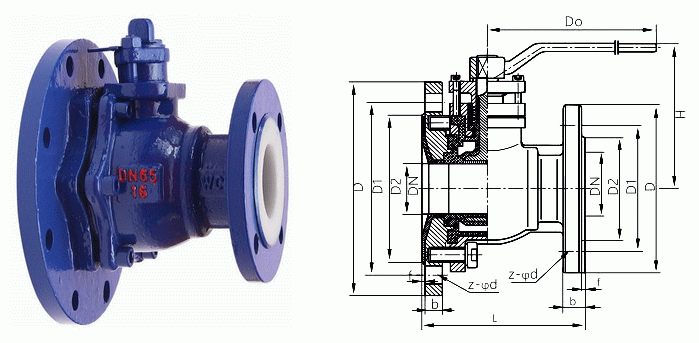 襯氟變徑球閥是一種將球閥的閥蓋改變成一個(gè)進(jìn)料口呈倒喇叭形的上體,并能直接與反應(yīng)釜釜底連接成一體,作為反應(yīng)釜的放料口,閥體則完全按浮動(dòng)球閥的裝配要求設(shè)計(jì)的球式放料閥,其球體與釜底間距小,不混料和沉積死料的可能性很小。該閥與介質(zhì)接觸的過(guò)流部件上全部模壓成型有氟塑料層,用來(lái)隔開流體與金屬表面的直接接觸,其中的球體與閥桿采用一體式金屬嵌件外包氟塑料工藝制造,具有耐腐密封性好、操作靈便快捷、強(qiáng)度高及經(jīng)久耐用等特點(diǎn)。