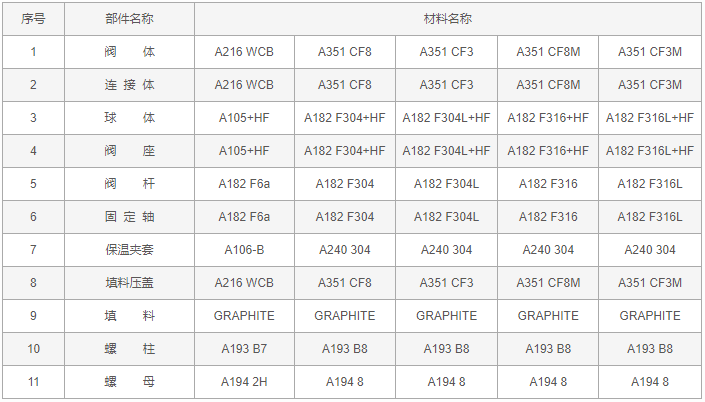 美標保溫球閥零件材料:
