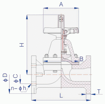 (6)采用螺桿升降結(jié)構(gòu),啟閉力矩大,平穩(wěn)性好。A、閥瓣開啟,流體進(jìn)入閥體,流阻小。 B、閥瓣向下緩閉,膜片向下開始變形,手輪旋轉(zhuǎn)力矩小。