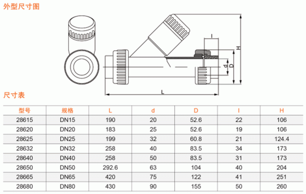 UPVC塑料Y型過濾器外形結(jié)構(gòu)及連接尺寸: