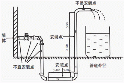 (2)安裝位置不要選在管道走向的最高點(diǎn),防止管道內(nèi)因有氣泡聚集而造成測(cè)量不正常。