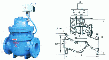 J841X電磁液(氣)動隔膜排泥閥是由液壓缸組件和直式截止閥組件,這兩大組件組成,其中又分為氣缸,膜片(活塞)、閥桿、閥瓣、上下支承座組成。當動力(液體)由膜片(活寒)上部進入氣動缸迫使活塞、膜片上行由閥桿帶動閥瓣上行打開閥瓣排出污物和泥沙,完成此動作后再將動力轉由活塞、膜片上部進入氣缸迫使活塞、膜片下行來關閉閥瓣,用這強制關閉的閥瓣絕對不會產生漏水現(xiàn)象。